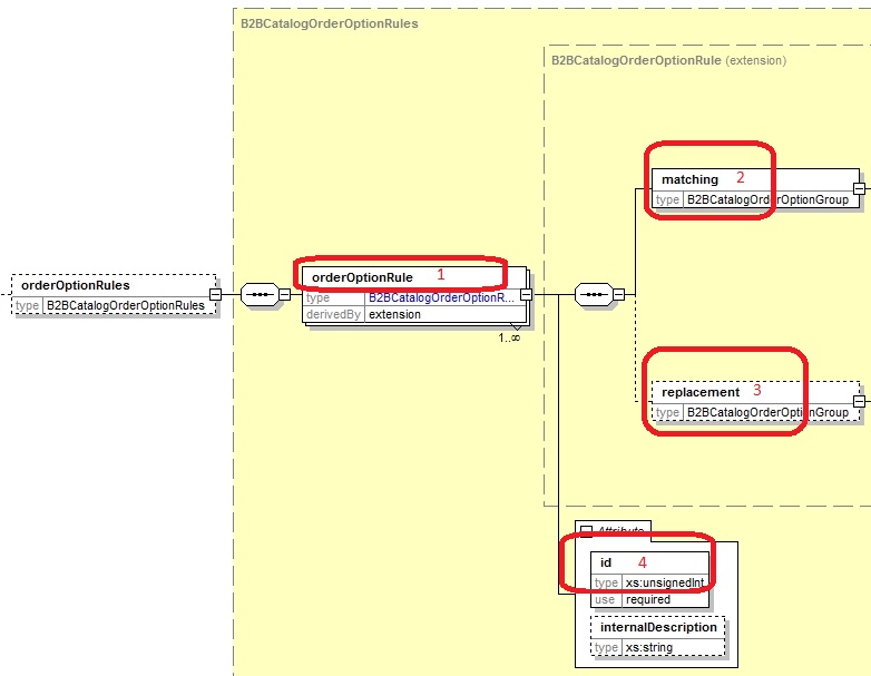 OrderOptions werden im Element B2BCatalogorderOptionGroup (3) zu einer Gruppe zusammen gefasst und mit einer ID (2) belegt. Es können mehrere Gruppen (1) definiert werden. Diese Gruppen können über die ID Gläsern und/oder Zuschlägen zugewiesen werden.