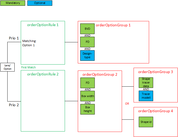 Prio 2, the second branche shows information beginning with only lens and OrderOptionsRule2 and OrderOptionsRule1 must be fullfilled.